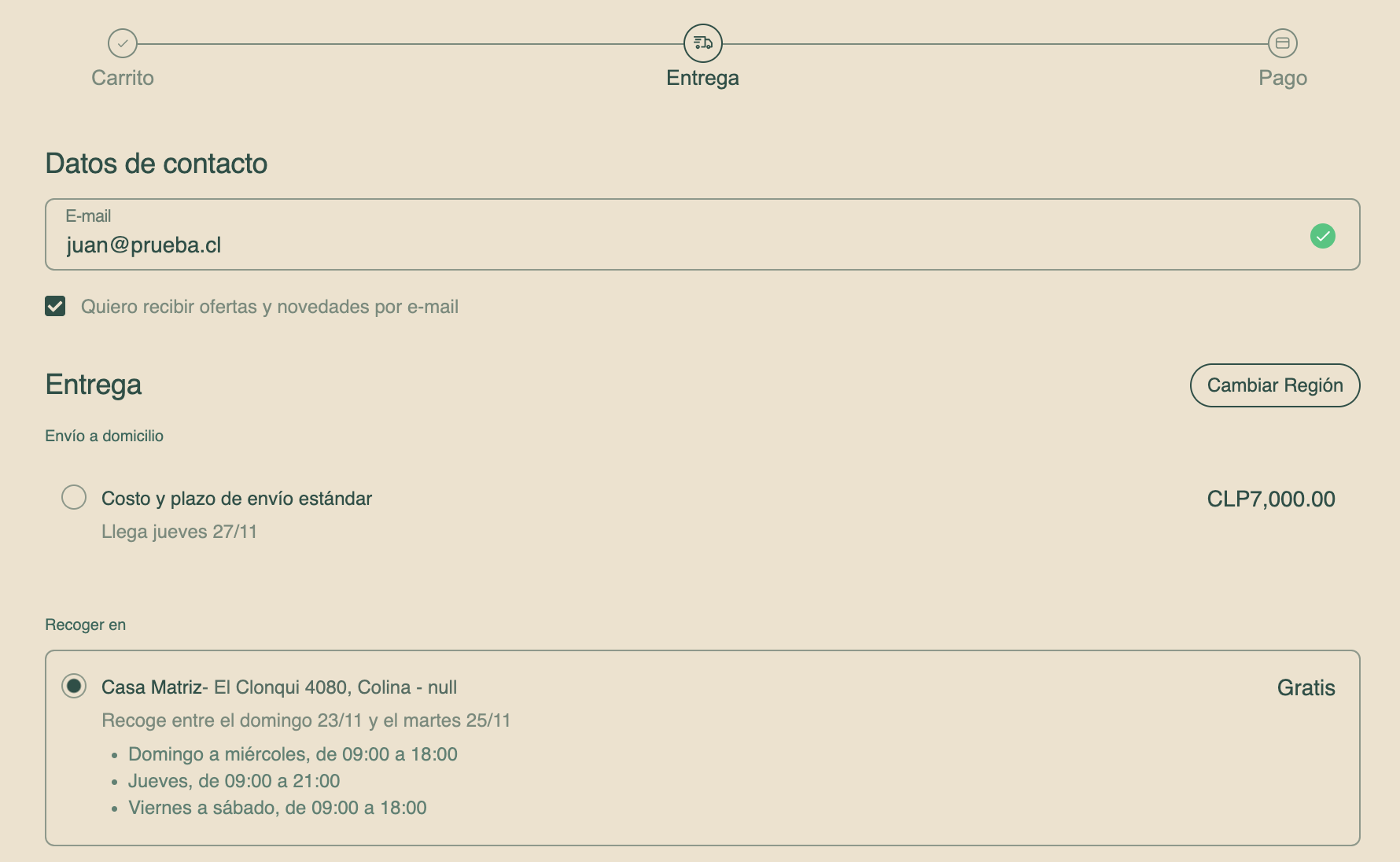 Ofrecemos diferentes opciones de envío para que elijas la que mejor se adapte a tus necesidades. Selecciónala y presiona "Continuar"