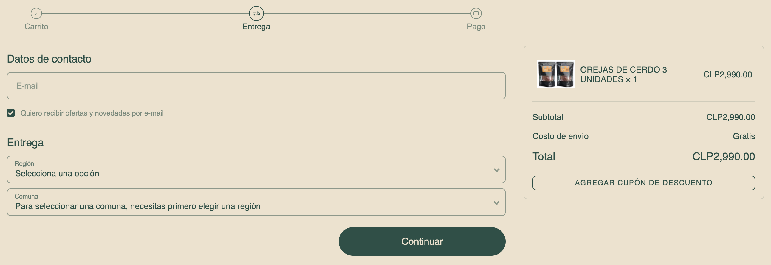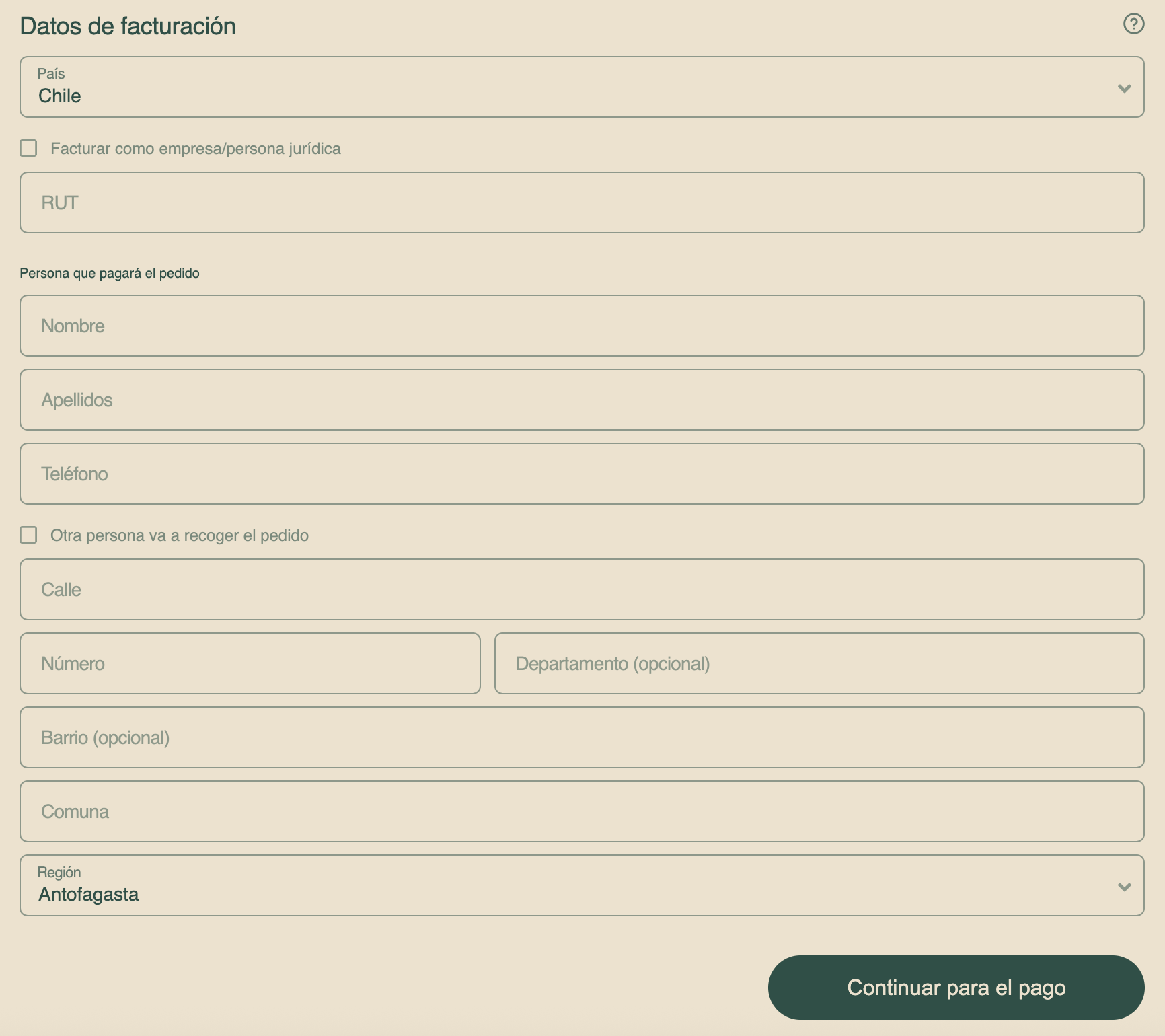 Para poder procesar tu pedido, ingresa tus datos solicitados en el formulario. Esto es fundamental para que podamos comunicarnos contigo si es necesario. Luego, presiona "Continuar".