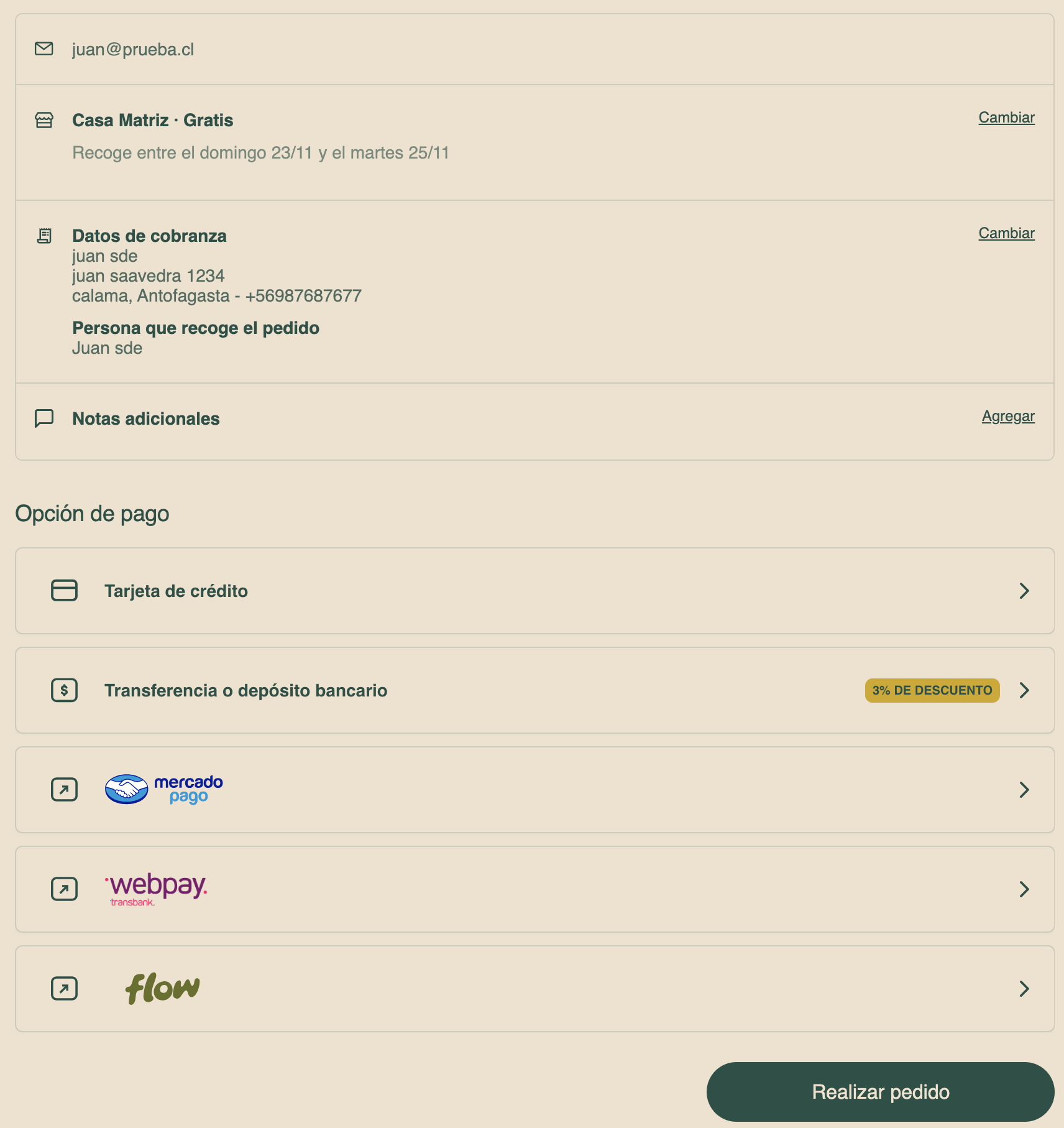 En la página de confirmación, revisa cuidadosamente todos los datos: productos, dirección, método de envío y pago. Si todo está correcto, confirma tu pedido.